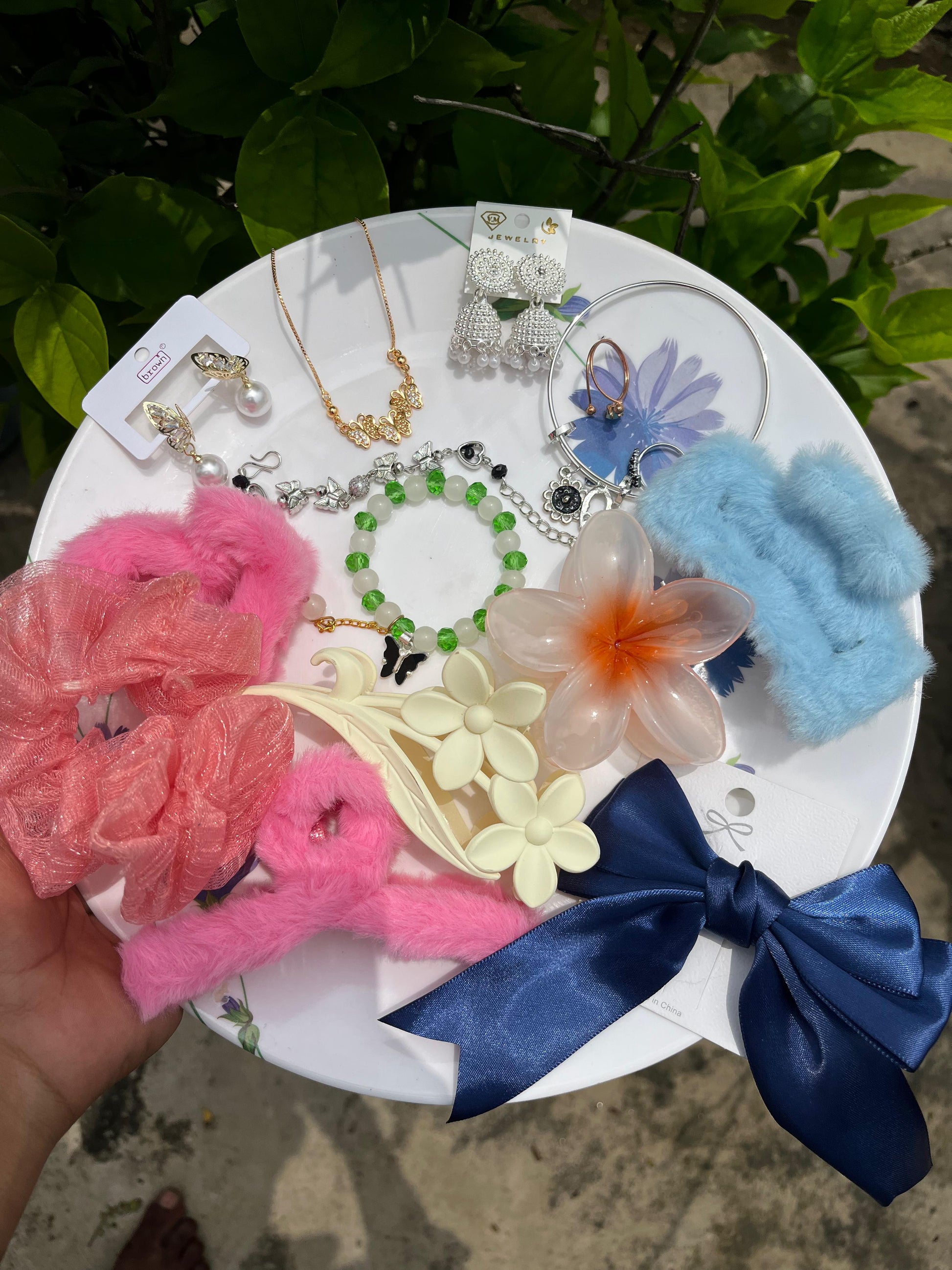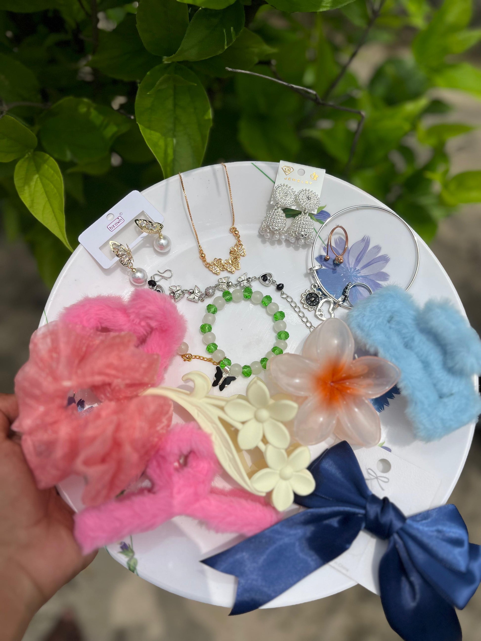 Premium quality products with 2 free ring .This curated accessory set is a perfect blend of elegance and fun. It includes trendy hair accessories, statement jewelry, and charming clips to complement any outfit. From pearl drop earrings and dainty necklaces to floral claws, bows, and soft scrunchies, every piece is handpicked to bring style and versatility to your look. Ideal for gifting or upgrading your own